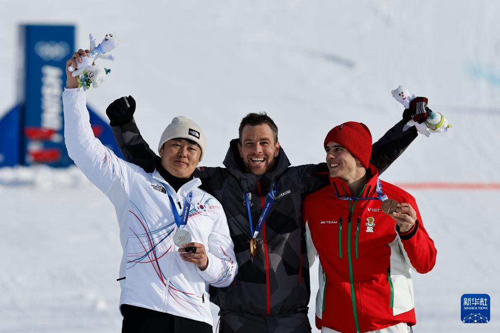 2月8日,冠军奥地利选手本亚明·卡尔(中)、亚军韩国选手金相谦(左)和季军保加利亚选手扎姆菲罗夫在颁奖仪式上合影。