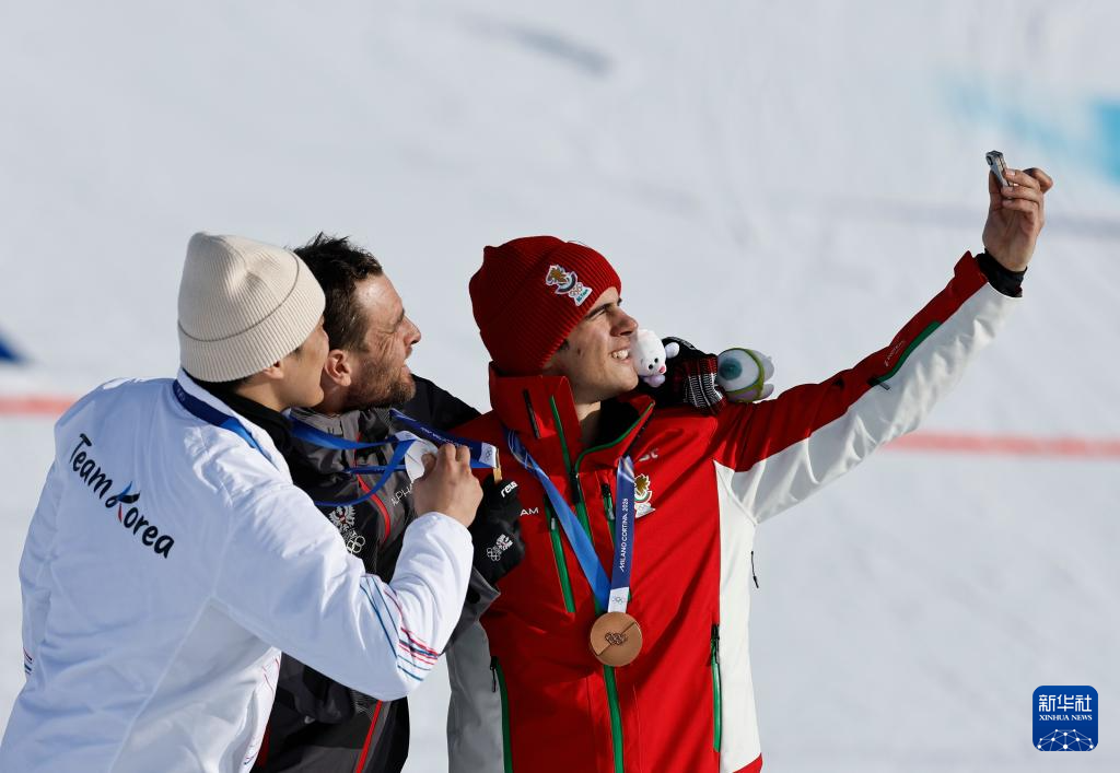 2月8日,冠军奥地利选手本亚明·卡尔(中)、亚军韩国选手金相谦(左)和季军保加利亚选手扎姆菲罗夫在颁奖仪式上自拍合影。