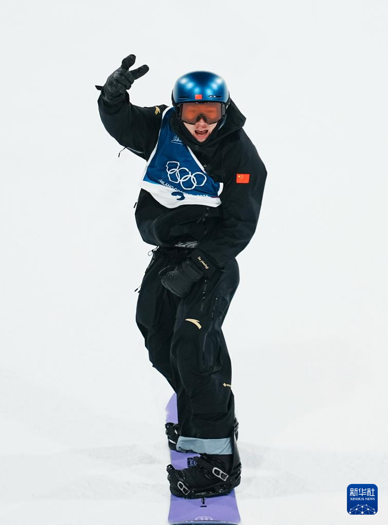 2月7日,中国选手苏翊鸣在第一跳后庆祝。