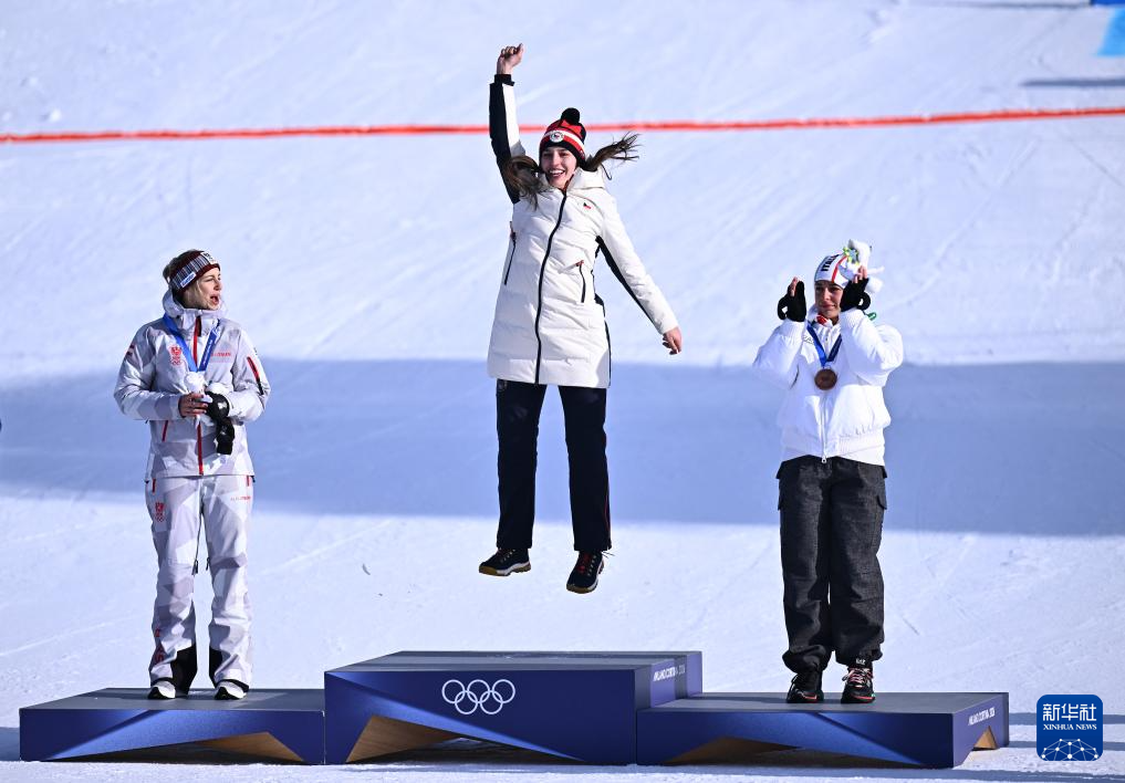 2月8日,冠军捷克选手马德罗娃(中)、亚军奥地利选手帕耶尔(左)、季军意大利选手达尔马索在颁奖仪式上。