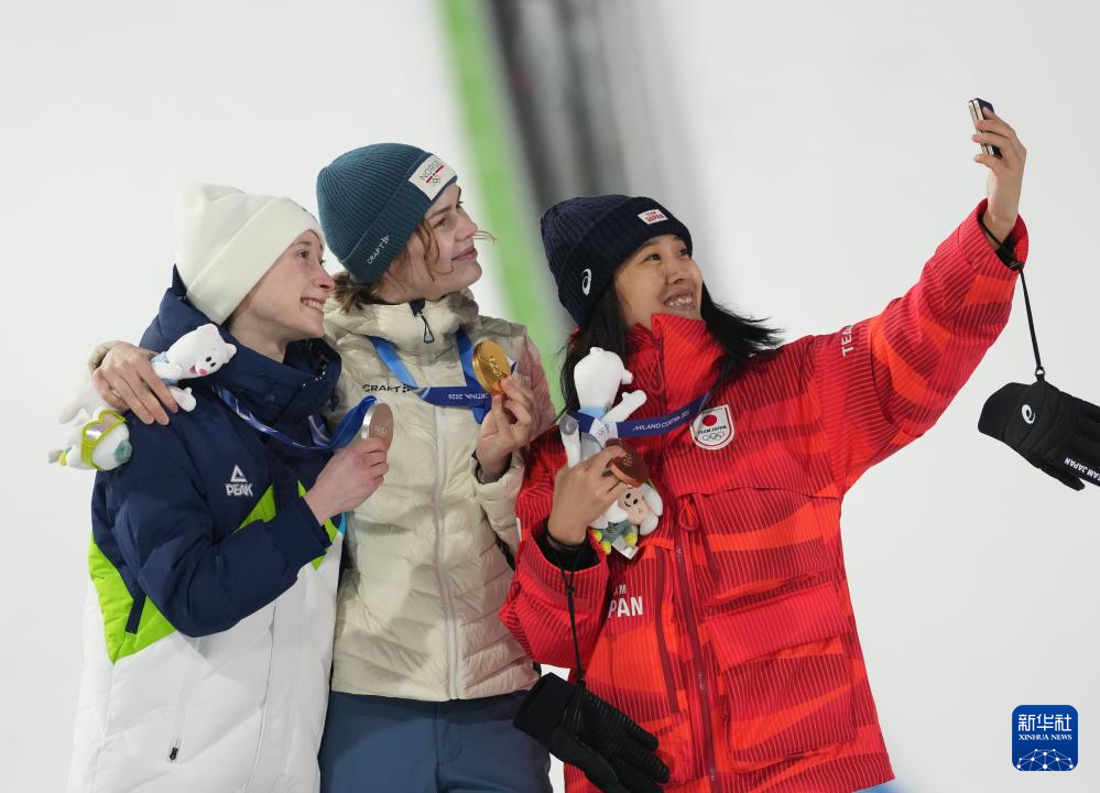 2月7日,冠军挪威选手安娜·奥迪娜·施特勒姆(中)、亚军斯洛文尼亚选手妮卡·普雷夫茨(左)和季军日本选手丸山奈绪美在颁奖仪式上自拍。