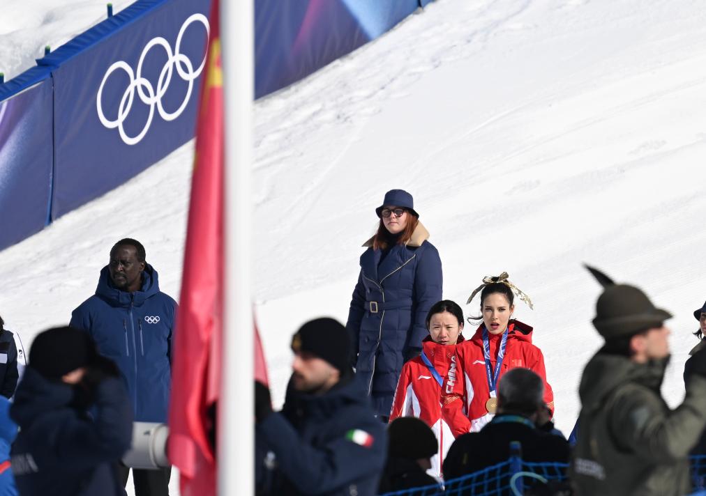 新华社意大利利维尼奥2月22日电(记者田光雨、刘旸)巍峨的雪山之间,两面冉冉升起的五星红旗在白雪蓝天的映衬下更加夺目,在场的上百名中国观众齐声高唱国歌,嘹亮的歌声在利维尼奥山谷回响。
