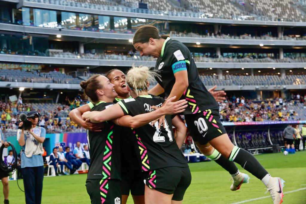 当地时间3月17日,在澳大利亚珀斯举行的2026年女足亚洲杯半决赛中,澳大利亚队2:1战胜中国队,晋级决赛。图为澳大利亚队球员在比赛中庆祝进球。新华社发(周丹摄)