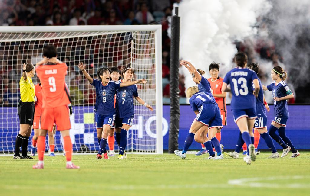 当地时间3月18日,在澳大利亚悉尼举行的2026年女足亚洲杯半决赛中,日本队4:1战胜韩国队,晋级决赛。图为日本队球员在比赛中庆祝进球。新华社发(胡泾辰摄)