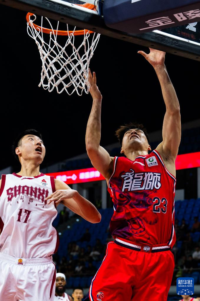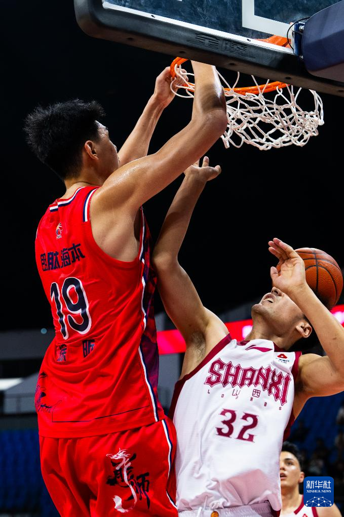 3月23日,广州朗肽海本队球员徐昕(左)在比赛中扣篮。