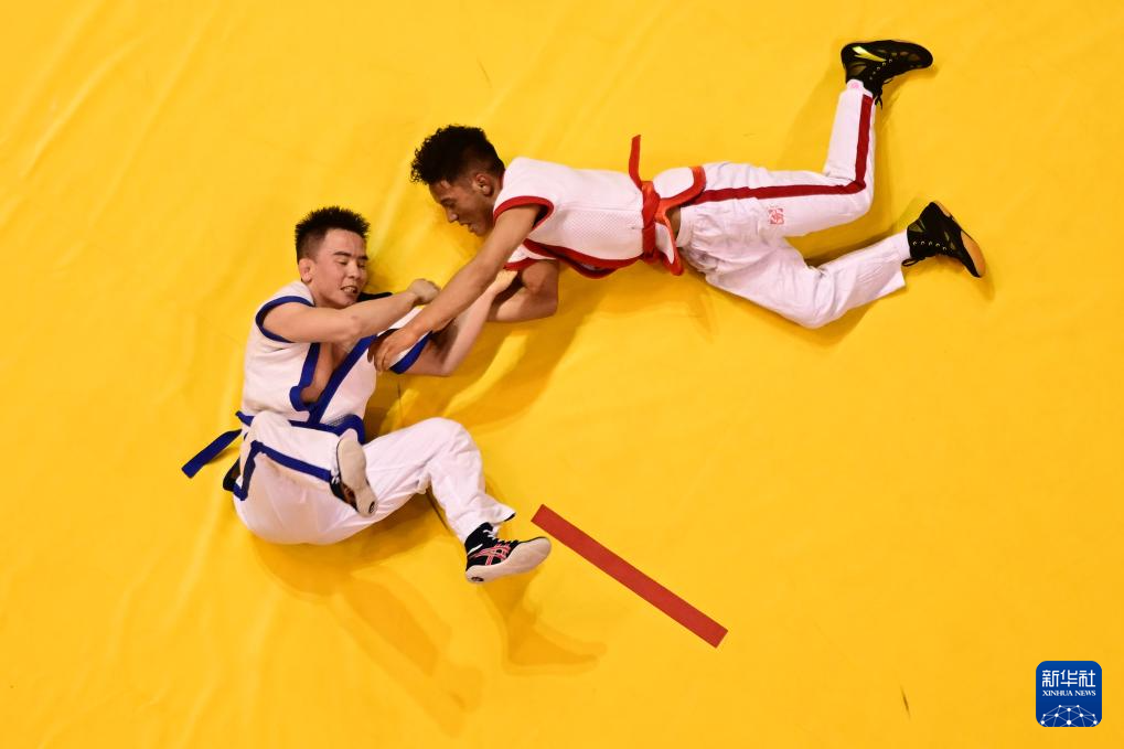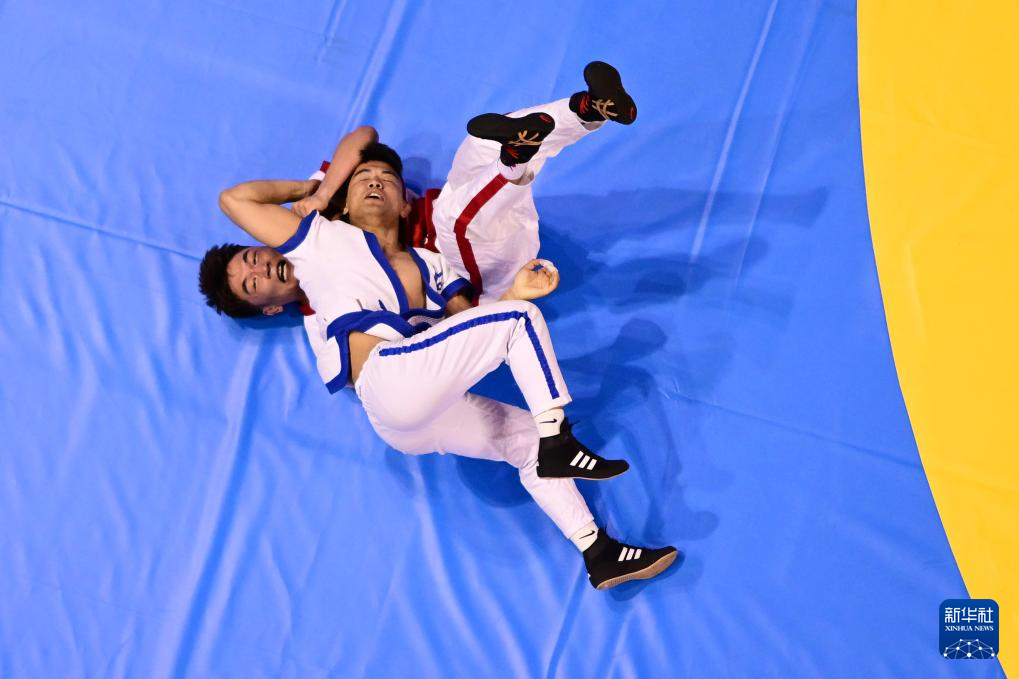3月24日,新疆队选手阿格坚·胡安西(左)与四川体育职业学院队选手乃古吉惹在男子56公斤级半决赛中。最终,阿格坚·胡安西战胜乃古吉惹,晋级决赛。