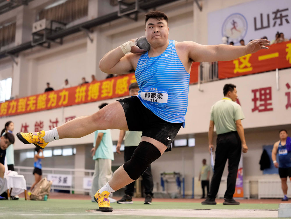 新华社济南3月27日电(记者张武岳)在山东济南举行的2026年全国室内田径锦标赛27日迎来首个比赛日,山东队选手邢家梁在男子铅球比赛中三次刷新了由自己保持的全国纪录,最终将纪录定格在20米95。