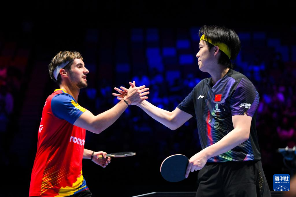 3月31日,中国选手王楚钦(右)与罗马尼亚选手爱德华·约内斯库赛后握手致意。