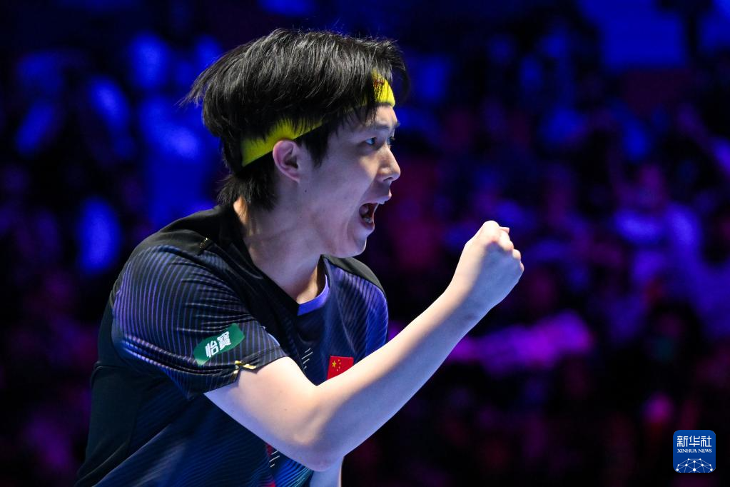 3月31日,中国选手王楚钦在比赛中庆祝得分。