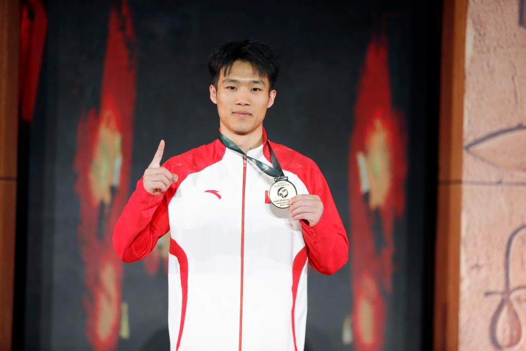 当地时间4月6日,2026年国际体联体操世界杯开罗站男子单杠决赛在埃及开罗举行。图为冠军中国选手李鸿颜在颁奖仪式上。新华社发(艾哈迈德·戈马摄)