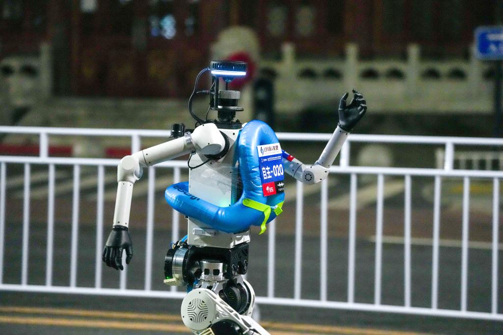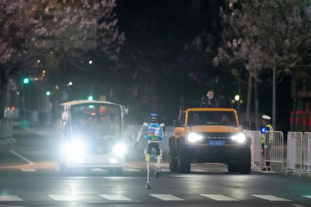 2025年4月19日,选手在北京亦庄半程马拉松暨人形机器人半程马拉松比赛中。新华社记者 曹灿 摄