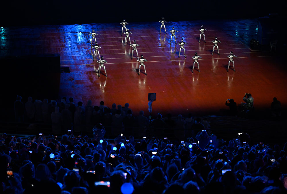 4月11日,机器人在“苏超”开幕式上表演。新华社记者 季春鹏 摄