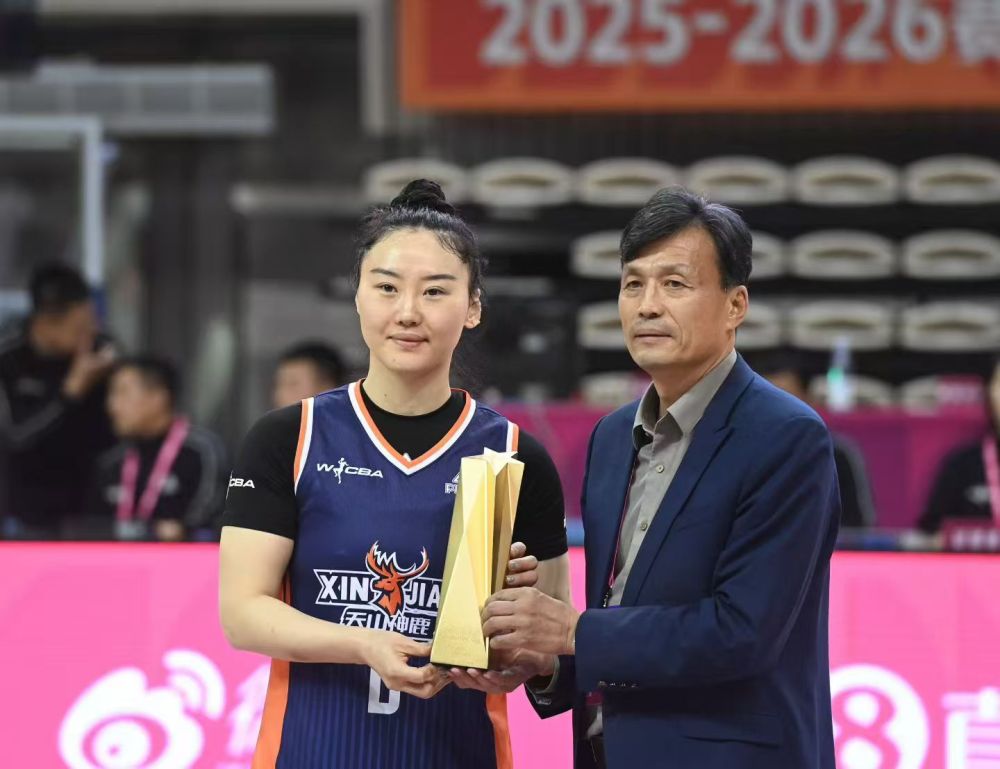 武桐桐在新疆女篮主场领取常规赛MVP奖杯。受访者供图