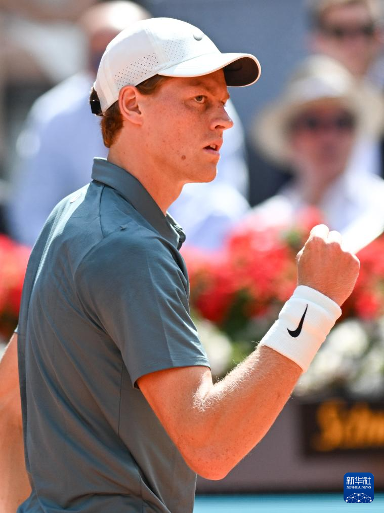 4月24日,意大利选手辛纳在比赛中庆祝得分。
