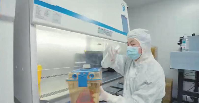 科研工作者给装有“太空小鼠”的盒子消毒。
